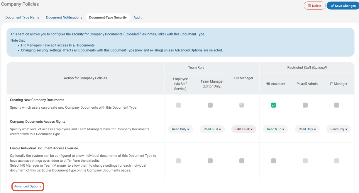 Making changes to the Record or Document Type Security will affect all Employee Records or Company Documents in that Category (new and existing), however, it is possible to enable Advanced Options which will enable an override feature. This feature allows individual Records or Company Documents to have access settings overridden by the uploader.